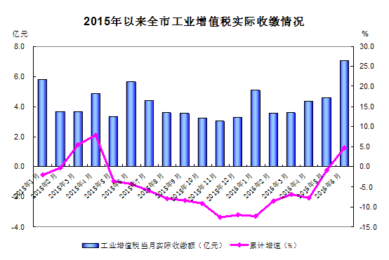 上半年全市工业增值税实际收缴28.18亿元,较上年同期增收1.26亿元,同比增长4.7%,高于前五个月5.5个百分点,经历了13个月负增长后再次重回正增长区间;6月份当月工业增值税实际收缴额为7.05亿元,是2015年以来当月收缴最大力度,当月增幅高达25.6%,也是续5月份后第二个月份高速正增长。工业增值税实际收缴的快速回升,预示着工业经济向好趋势,也对工业经济运行触底反弹提供了重要支撑。